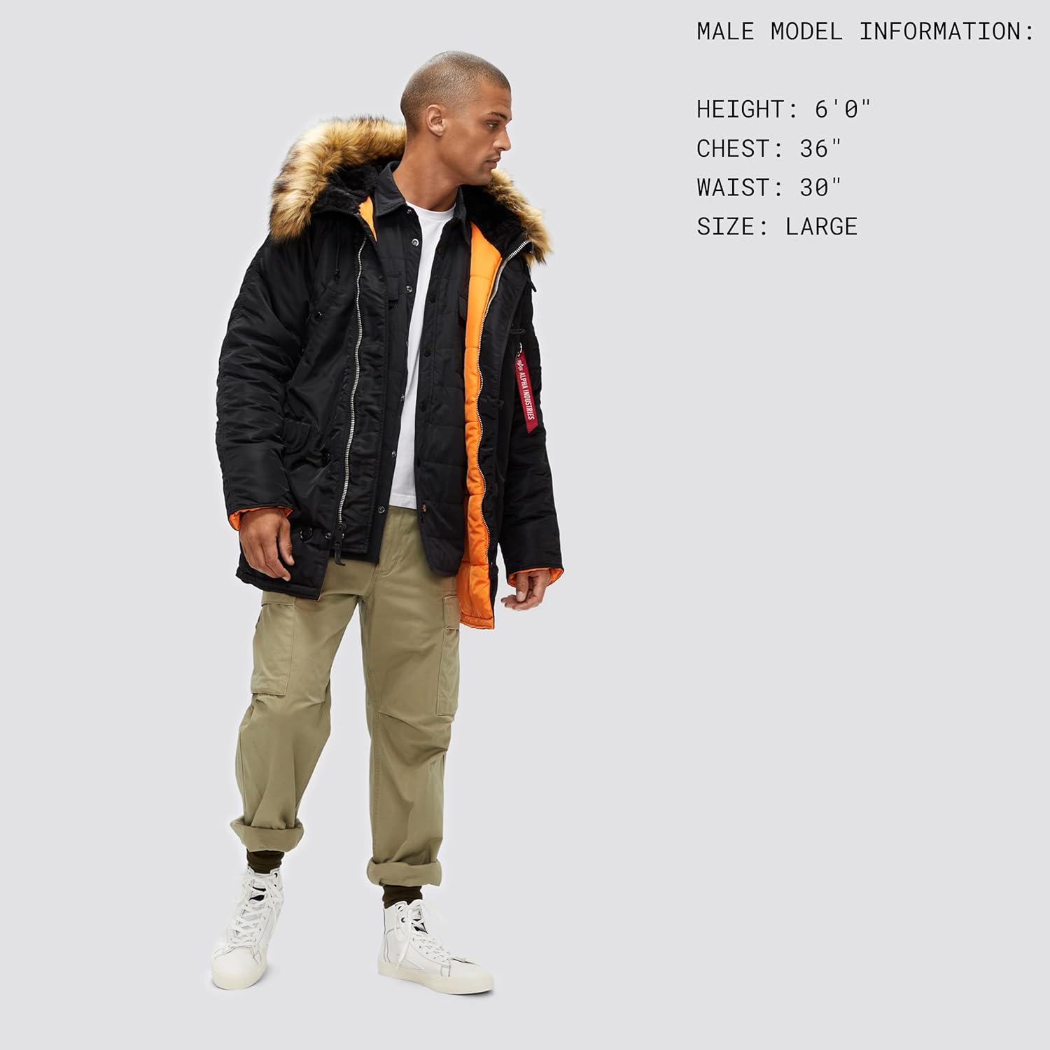 PRODUCT DETAILS Alpha's classic N-3B parka with channel quilted lining for Extreme Cold Weather situations in a contemporary standard fit with contrast lining. Male Model Information: Height: 6'0' Chest: 36' Waist: 30' Size: L BENEFITS Water Resistant FEATURES Snorkel hood Removable faux fur around hood Faux mouton lined hood Buckled hood adjuster Channel quilted lining Storm flap MA-1 utility pocket on sleeve Signature red “Remove Before Flight” flag Sleeve shirring Two exterior handwarmer pockets Two lower flap pockets One interior patch pocket Ottoman knit cuffsÂ