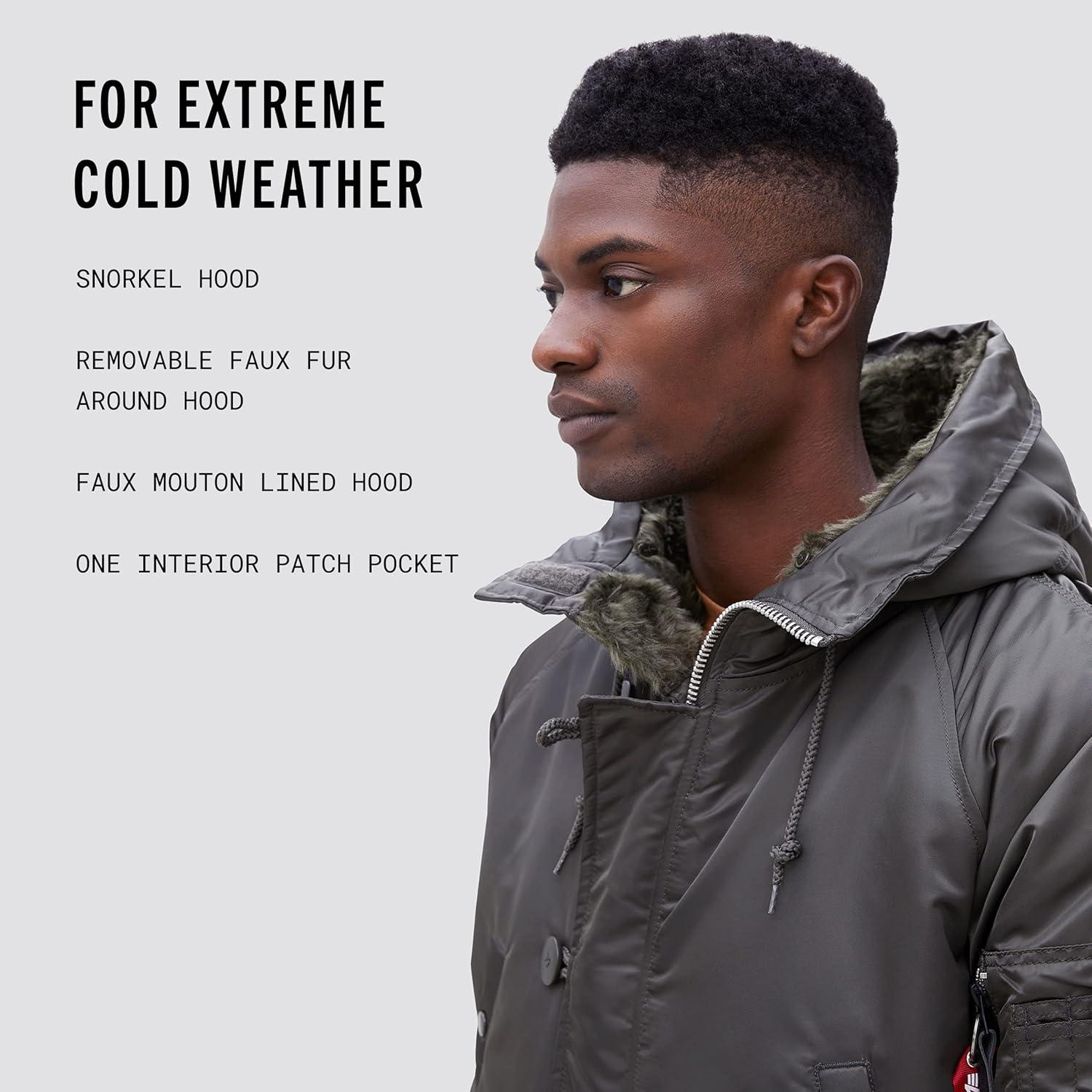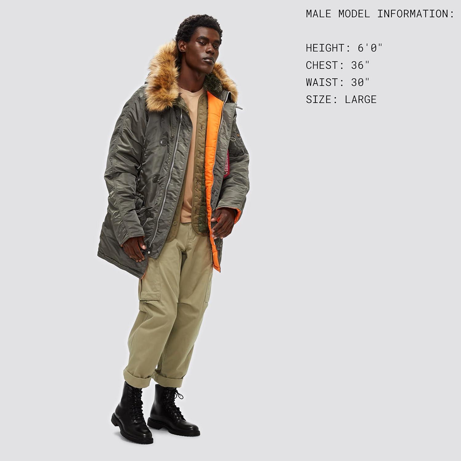 PRODUCT DETAILS Alpha's classic N-3B parka with channel quilted lining for Extreme Cold Weather situations in a contemporary standard fit with contrast lining. Male Model Information: Height: 6'0' Chest: 36' Waist: 30' Size: L BENEFITS Water Resistant FEATURES Snorkel hood Removable faux fur around hood Faux mouton lined hood Buckled hood adjuster Channel quilted lining Storm flap MA-1 utility pocket on sleeve Signature red “Remove Before Flight” flag Sleeve shirring Two exterior handwarmer pockets Two lower flap pockets One interior patch pocket Ottoman knit cuffsÂ